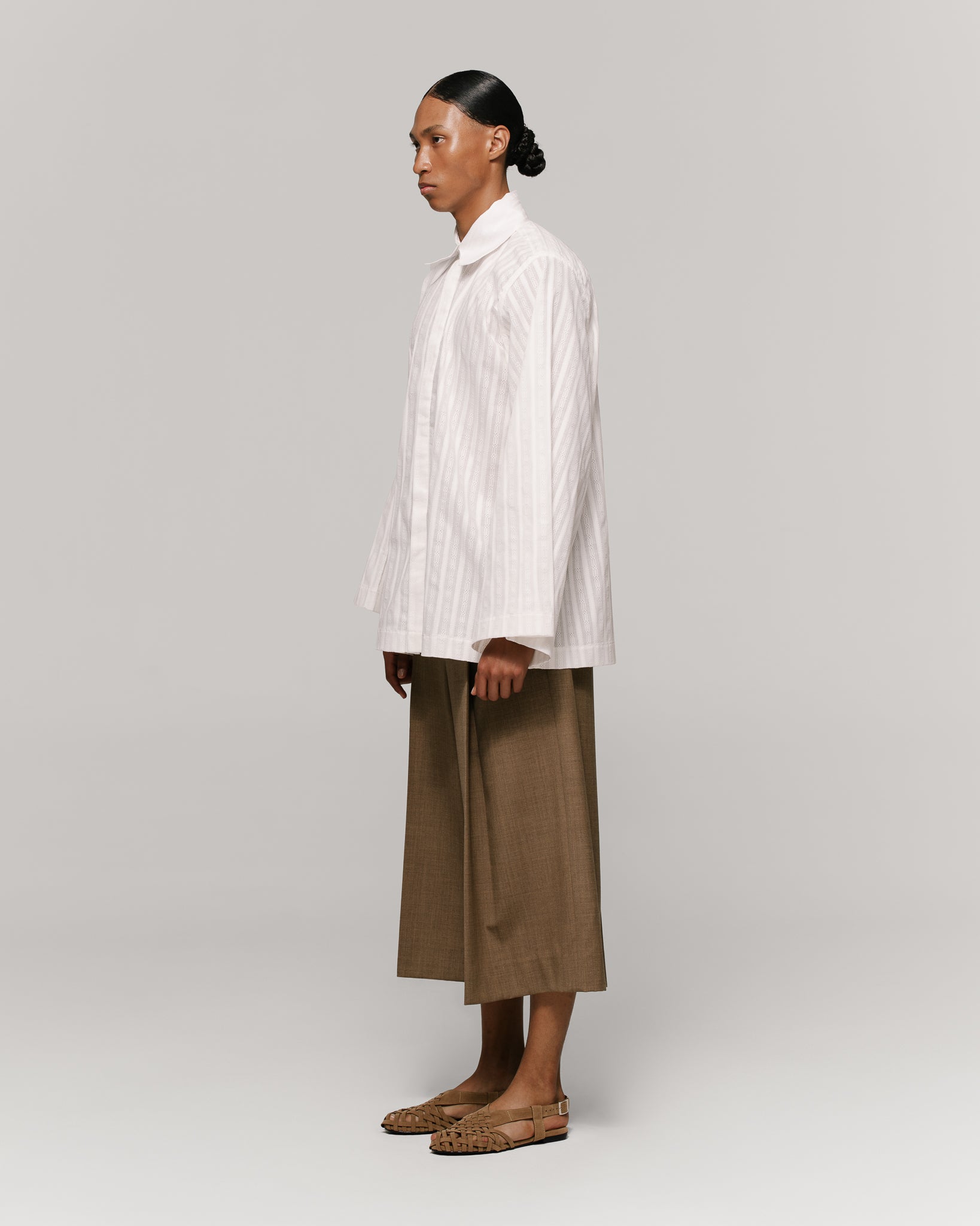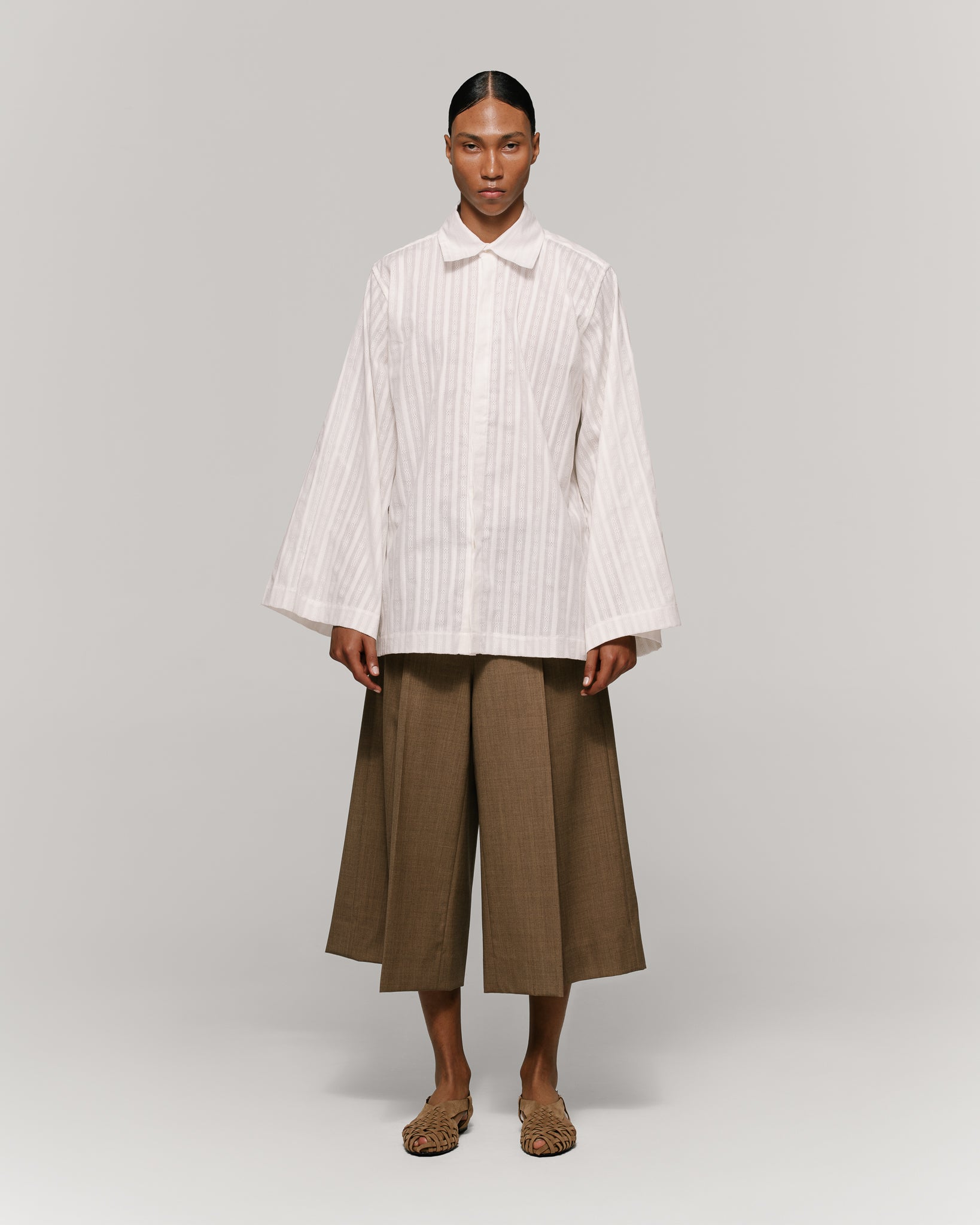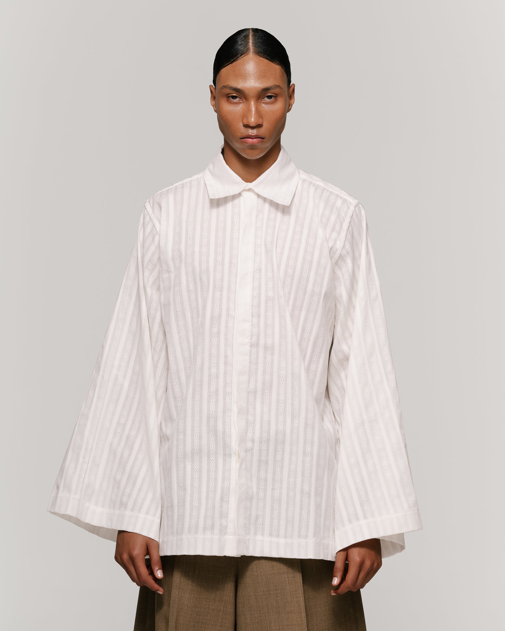 Shirt in white striped-texture fabric, with French collar and hidden placket. Wide silhouette. Detailed with extended structured cuffs.