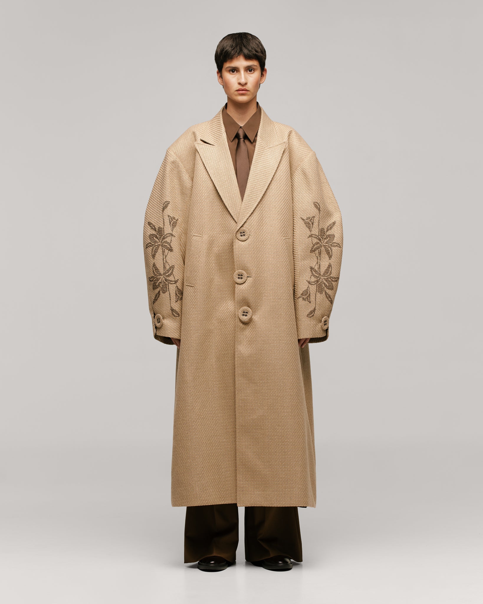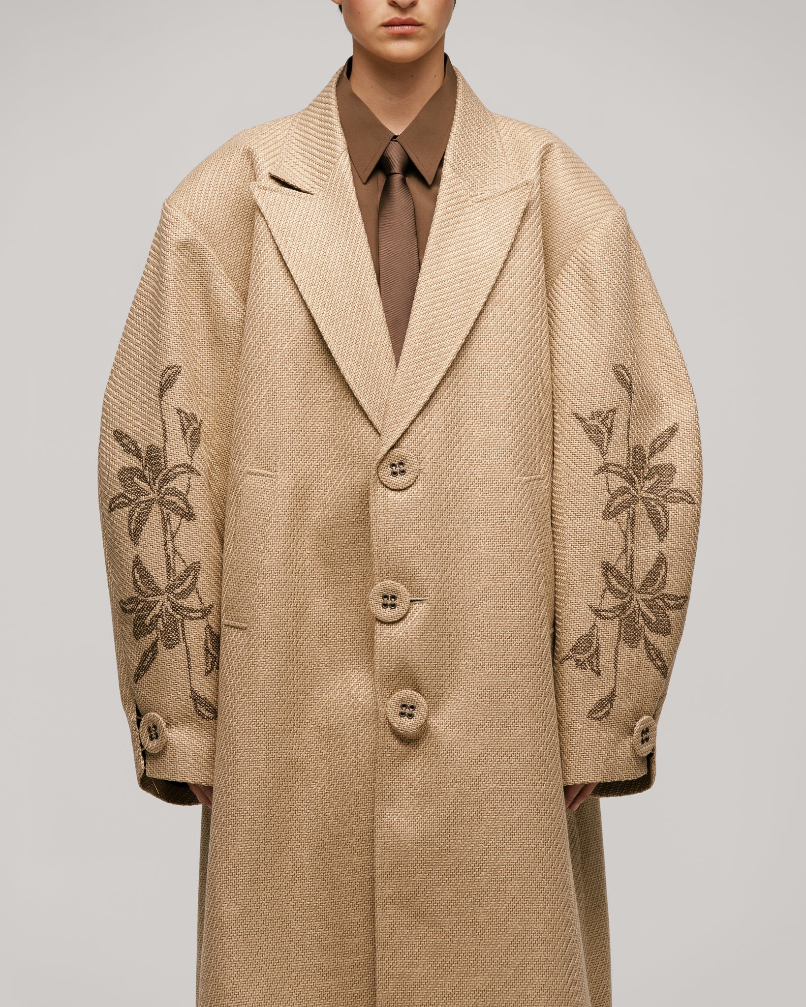 Coat in jute and polyester fabric, oversized silhouette. Front button closure with 3 fabric-covered buttons. Wide pointed lapels. Diagonal welt pockets. Floral embroidery motif in cross-stitch technique located on the sleeves. Viscose lining.
