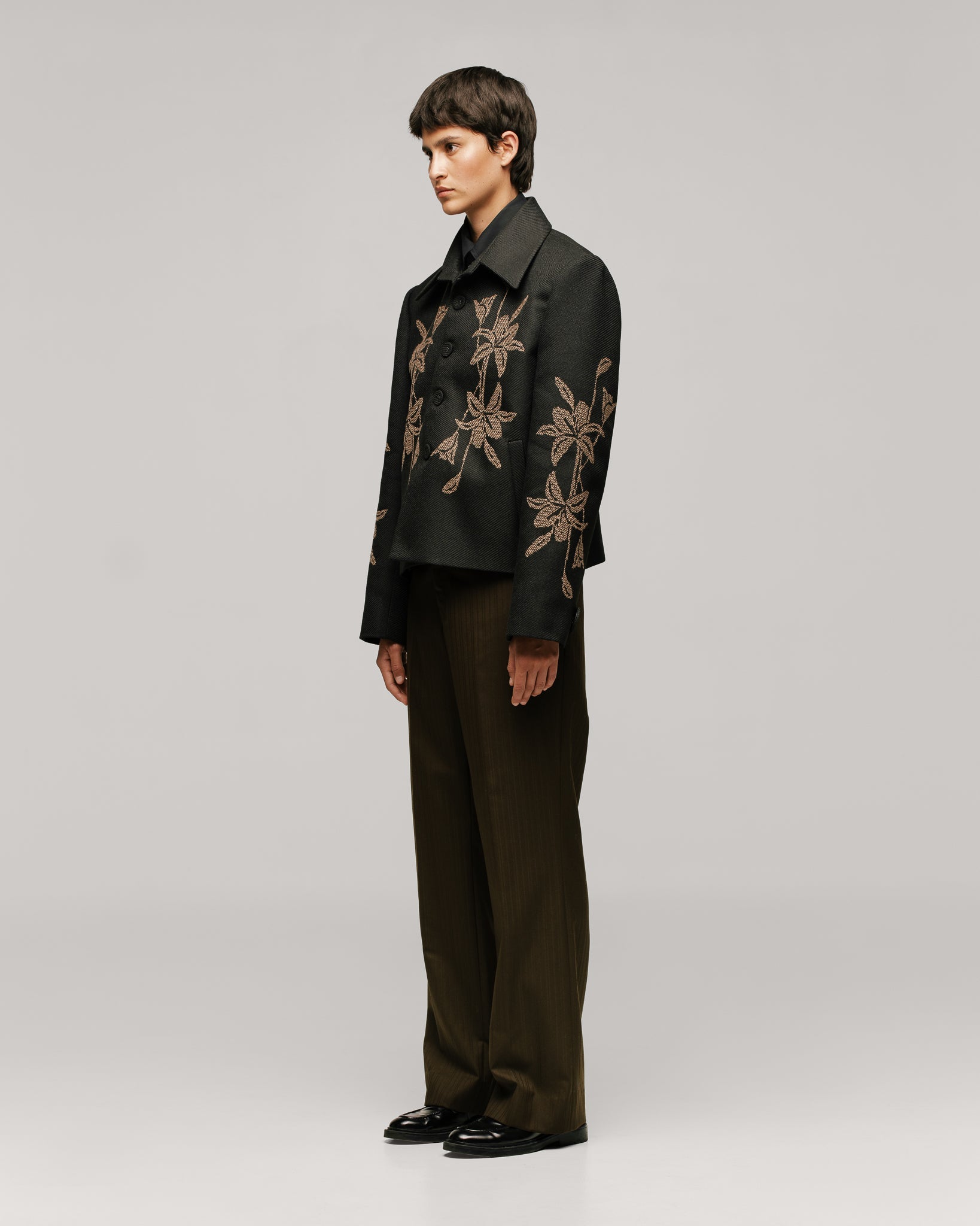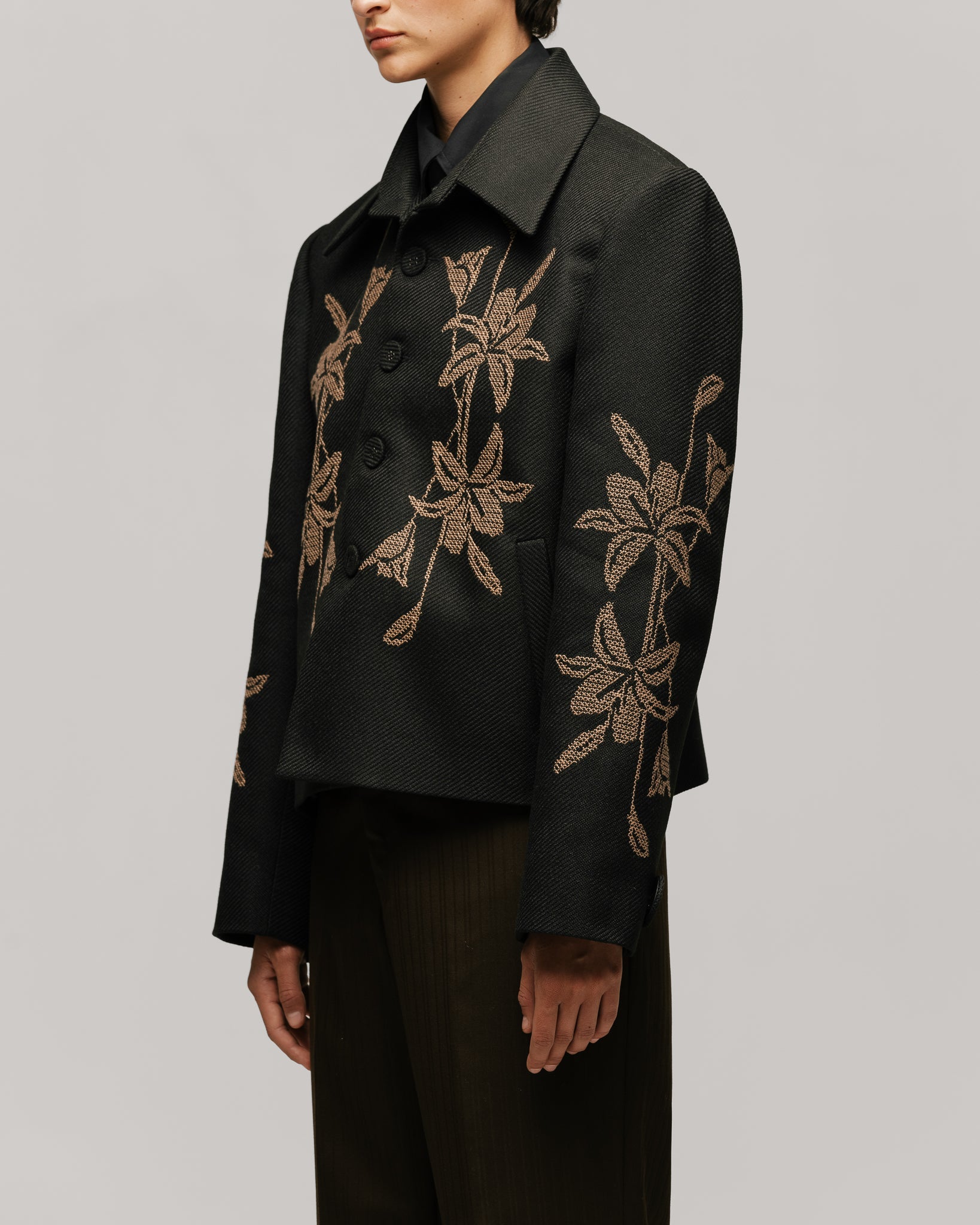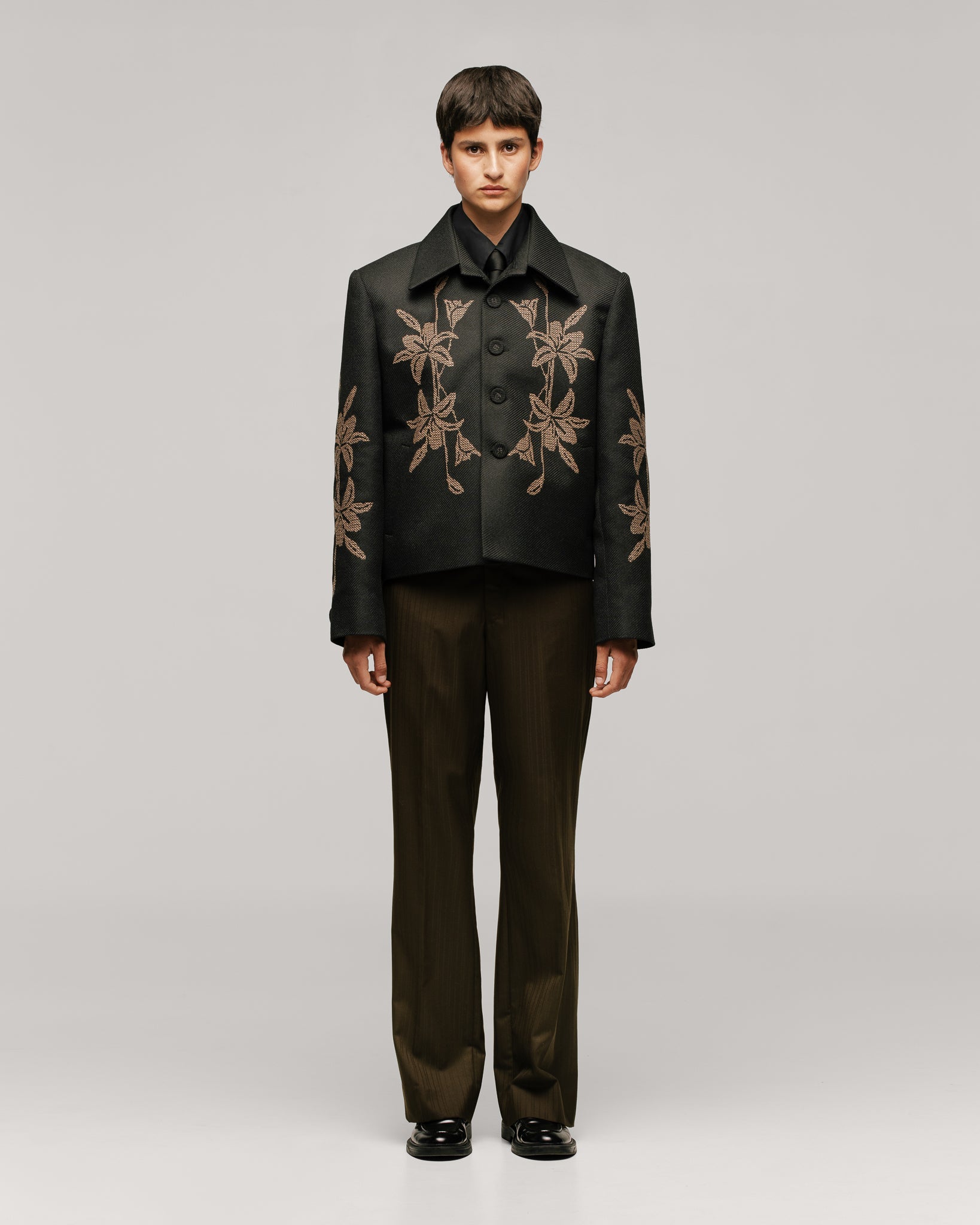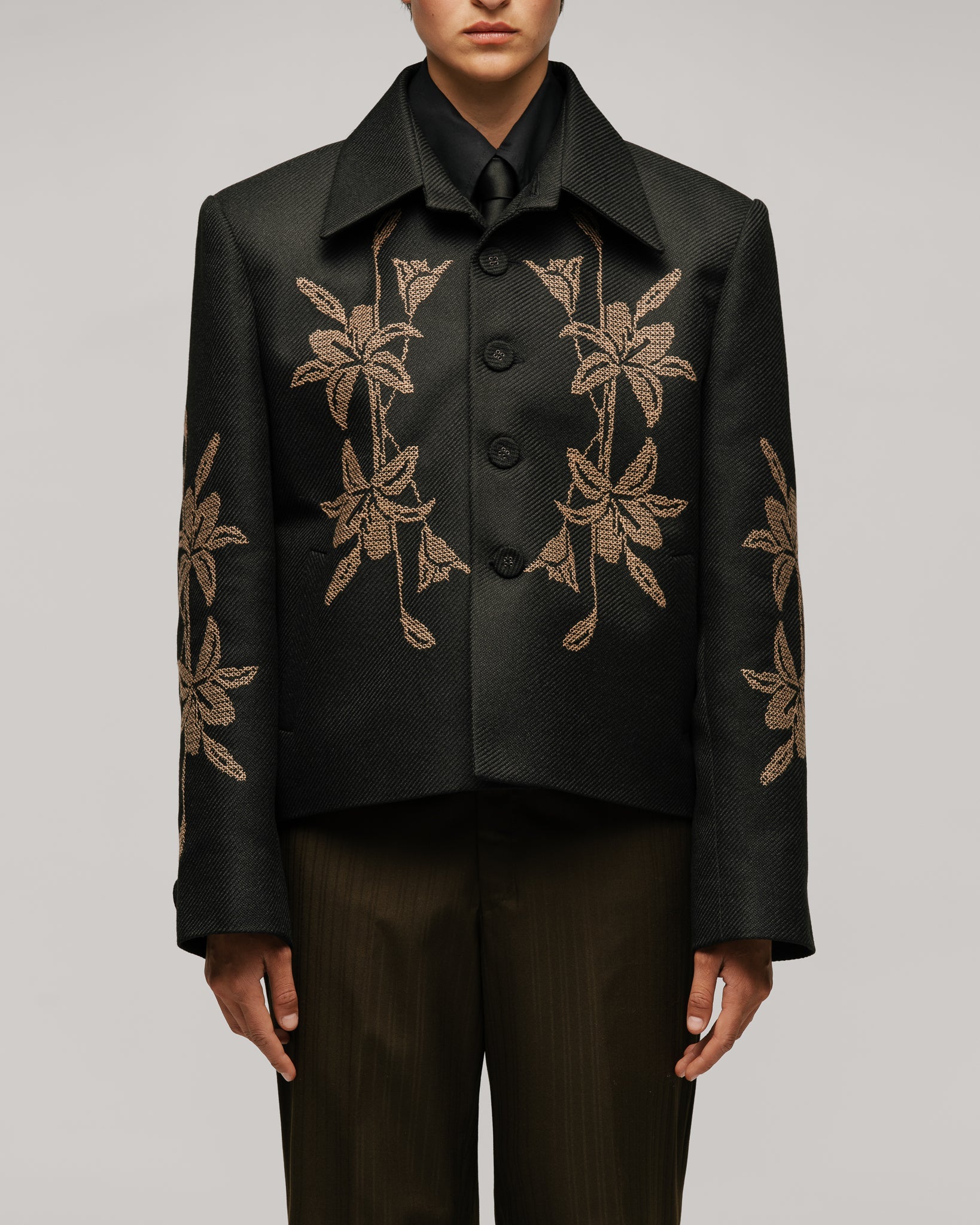 Short jacket in jute and polyester fabric, straight silhouette. Front button closure with fabric-covered buttons. Sport collar. Diagonal welt pockets. Pocket square on the chest. Floral embroidery motif in cross-stitch technique located on the sleeves and front panels. Viscose lining.