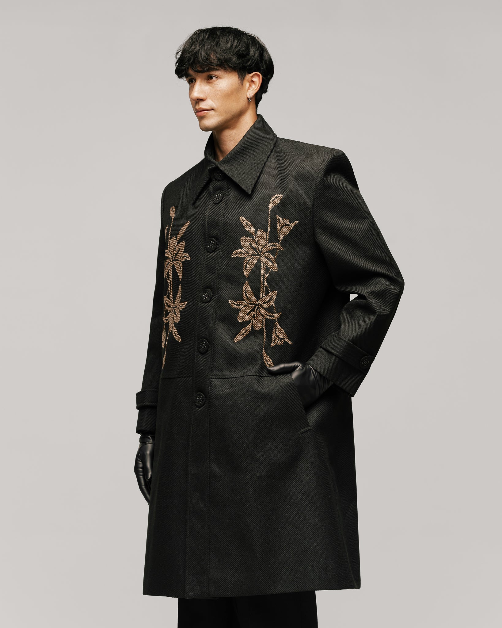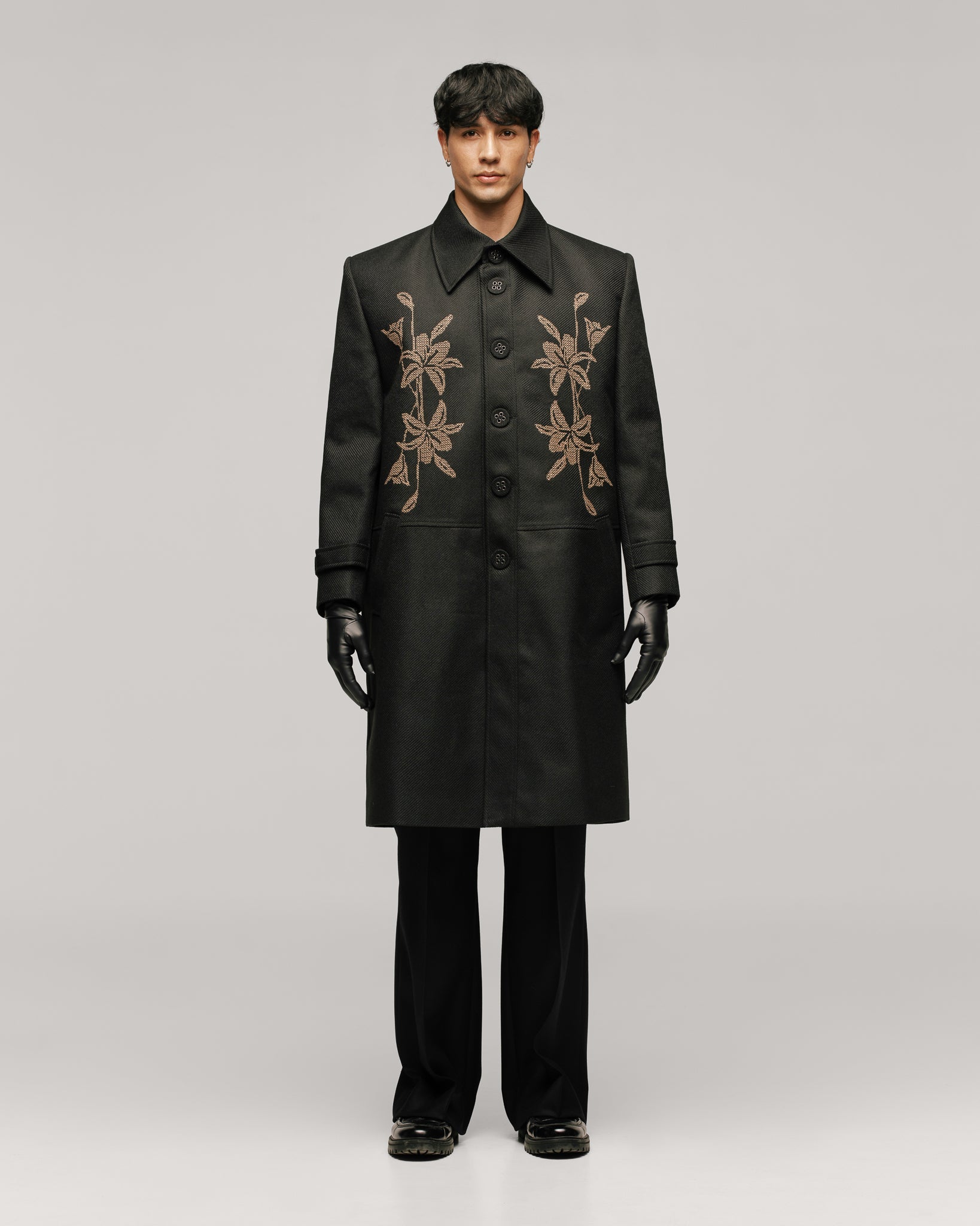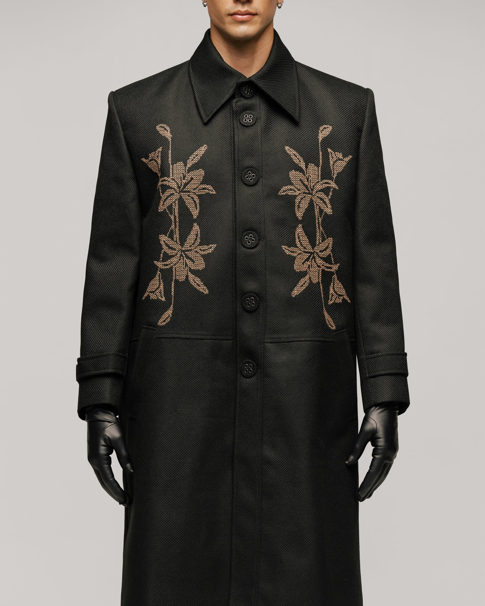 Coat in jute and polyester fabric, straight silhouette. Front button closure with fabric-covered buttons. Sport collar. Diagonal welt pockets. Floral embroidery motif in cross-stitch technique located on the front panels. Viscose lining.