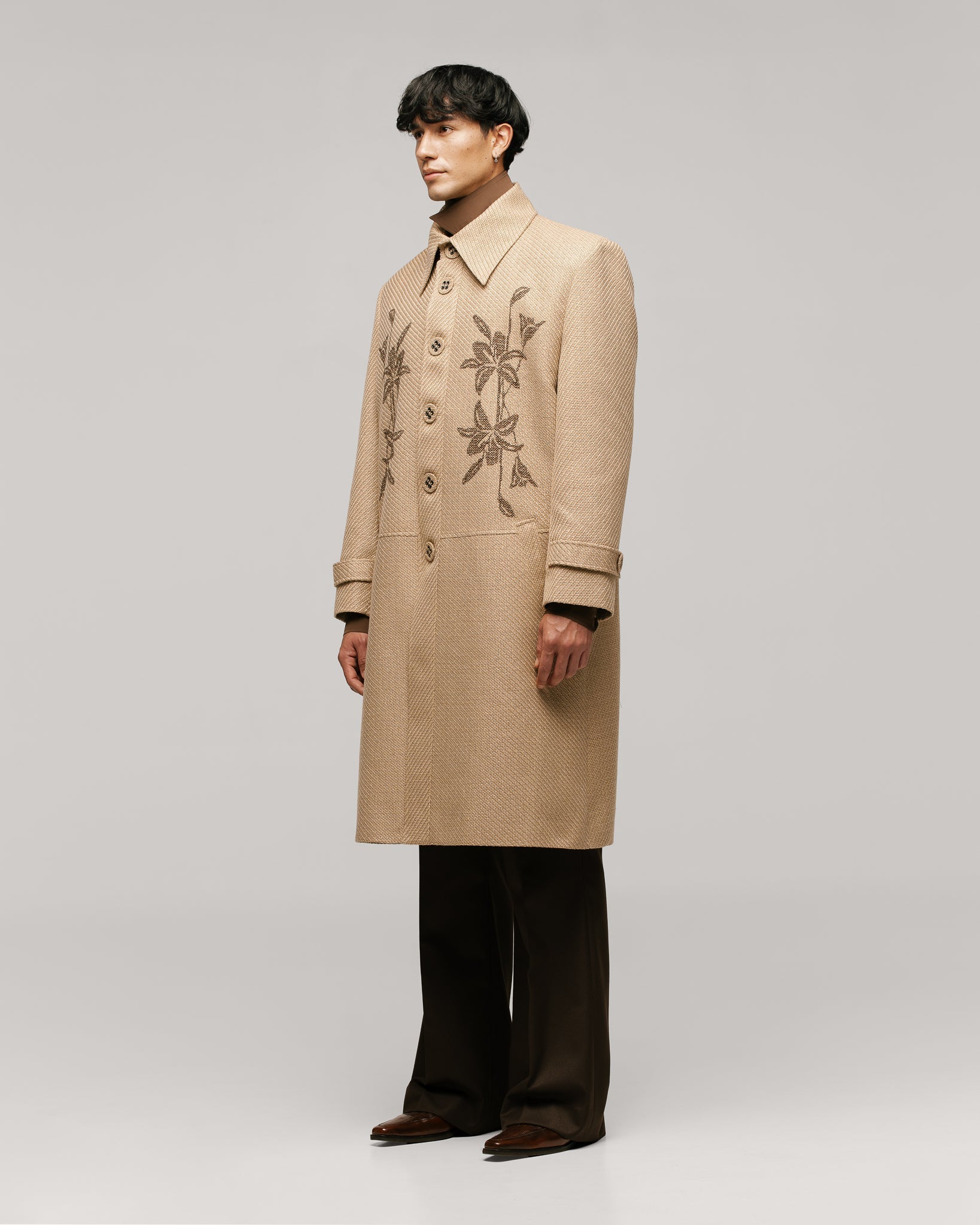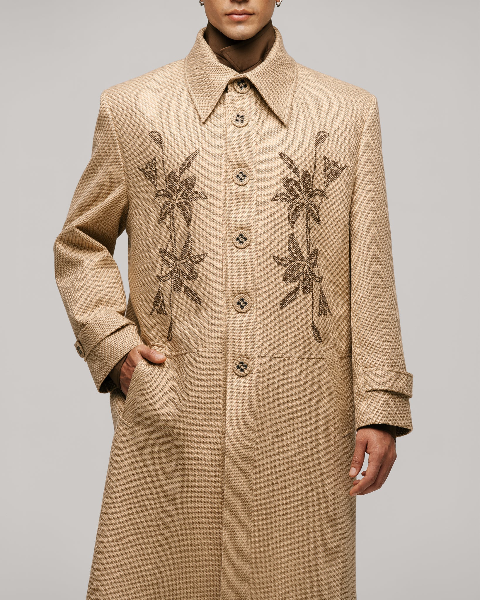 Coat in jute and polyester fabric, straight silhouette. Front button closure with fabric-covered buttons. Sport collar. Diagonal welt pockets. Floral embroidery motif in cross-stitch technique located on the front panels. Viscose lining.
