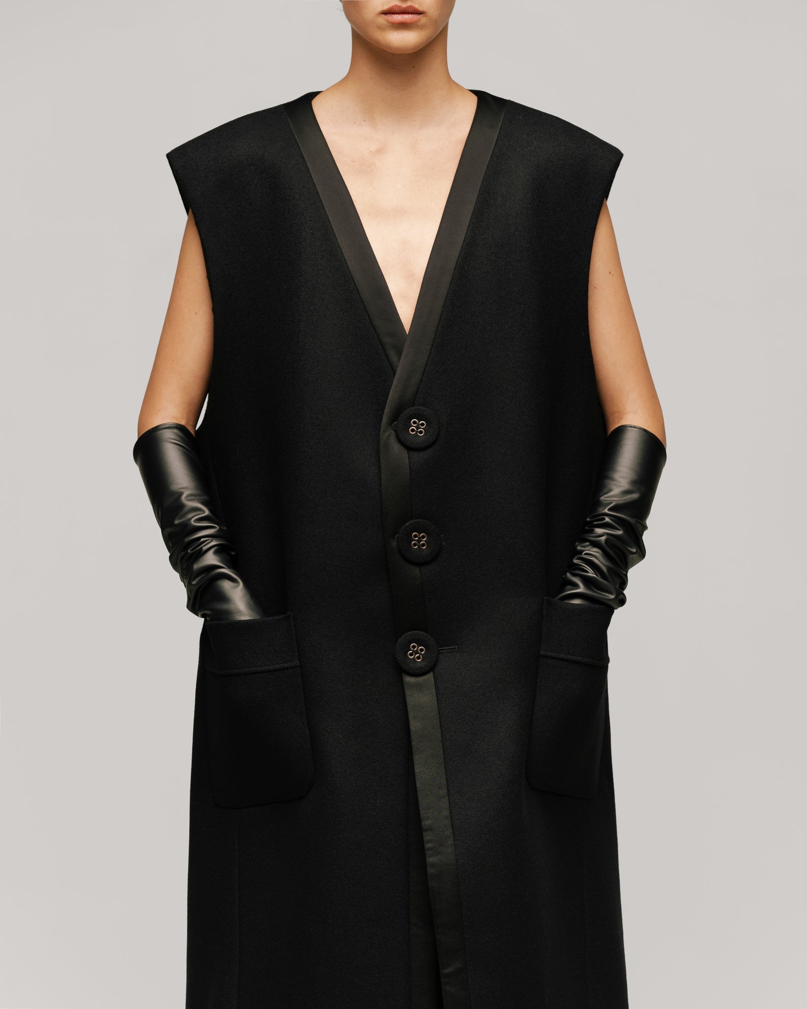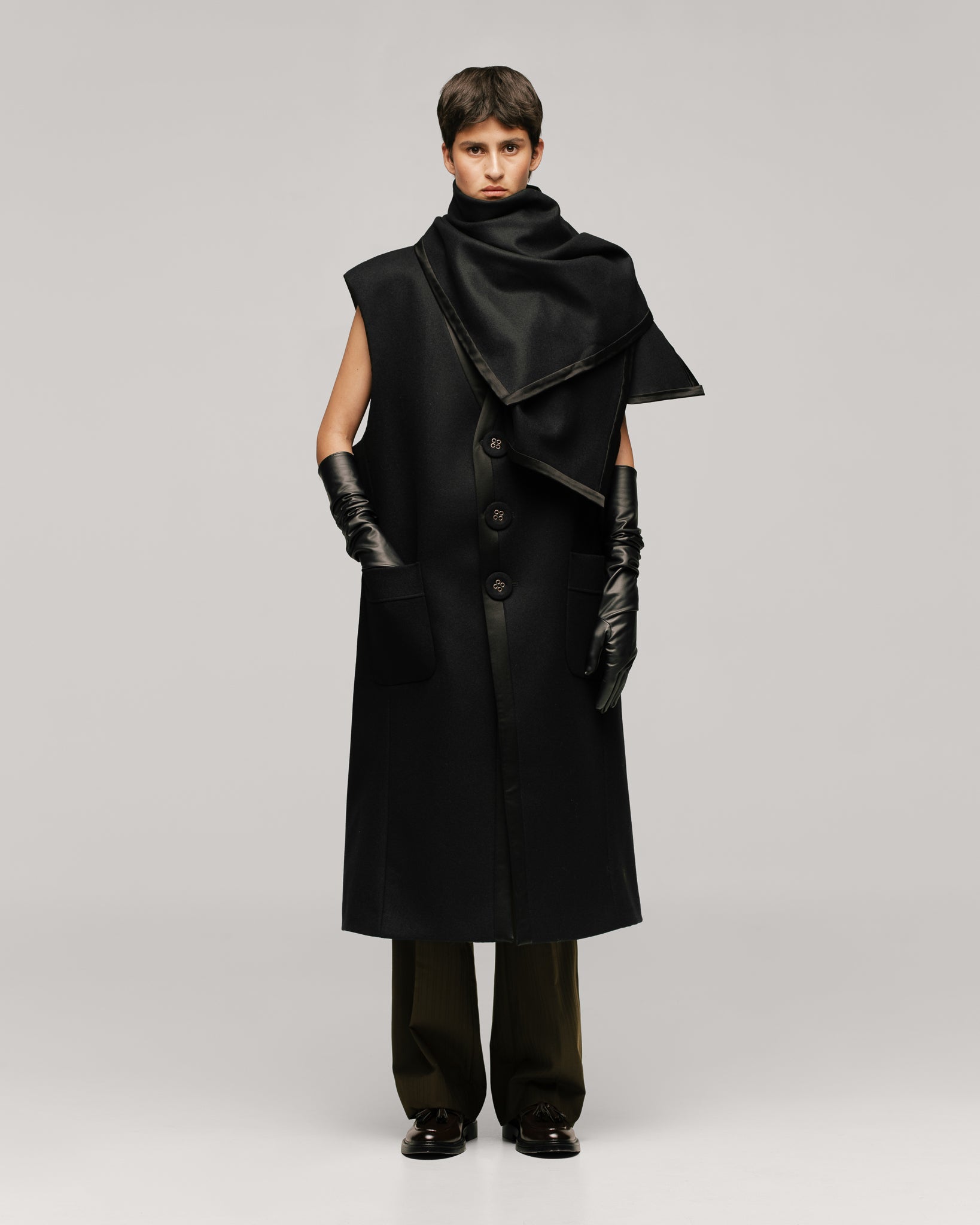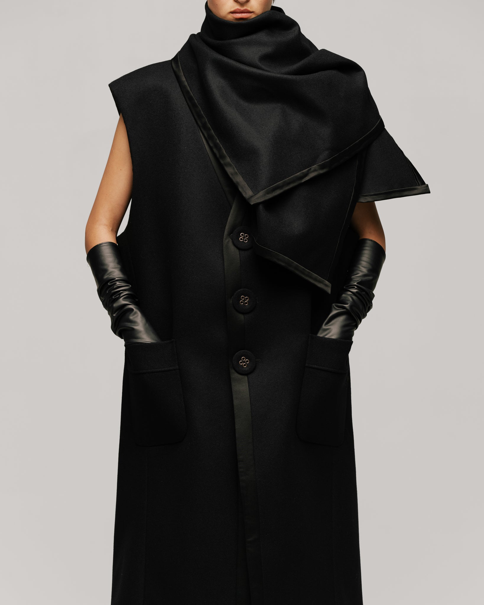 Chaleco largo estructurado en paño negro, con escote profundo en “V” y silueta recta y amplia. Detalles en seda en la botonadura y solapas simuladas, bolsillos frontales de parche. Interior forrado en viscosa. Bufanda complementaria en paño, bordes en seda.