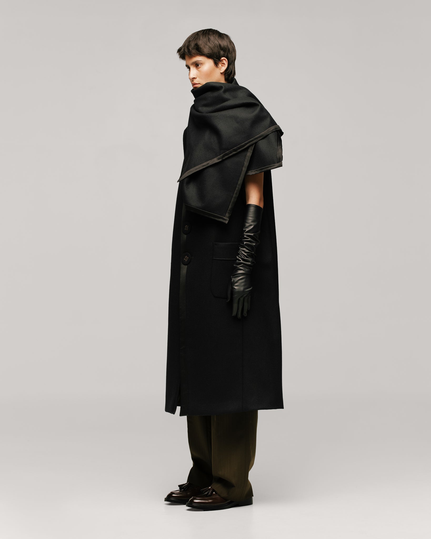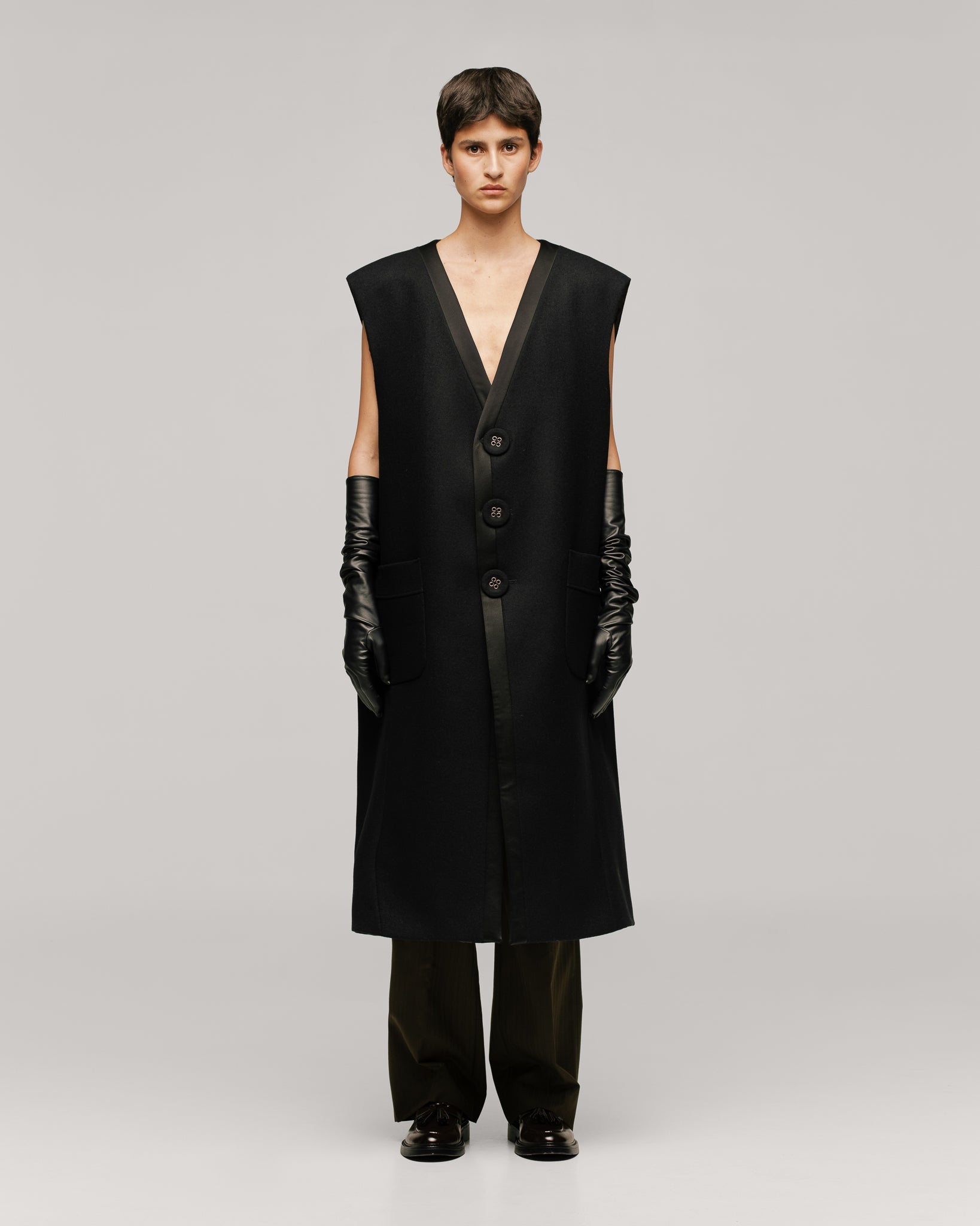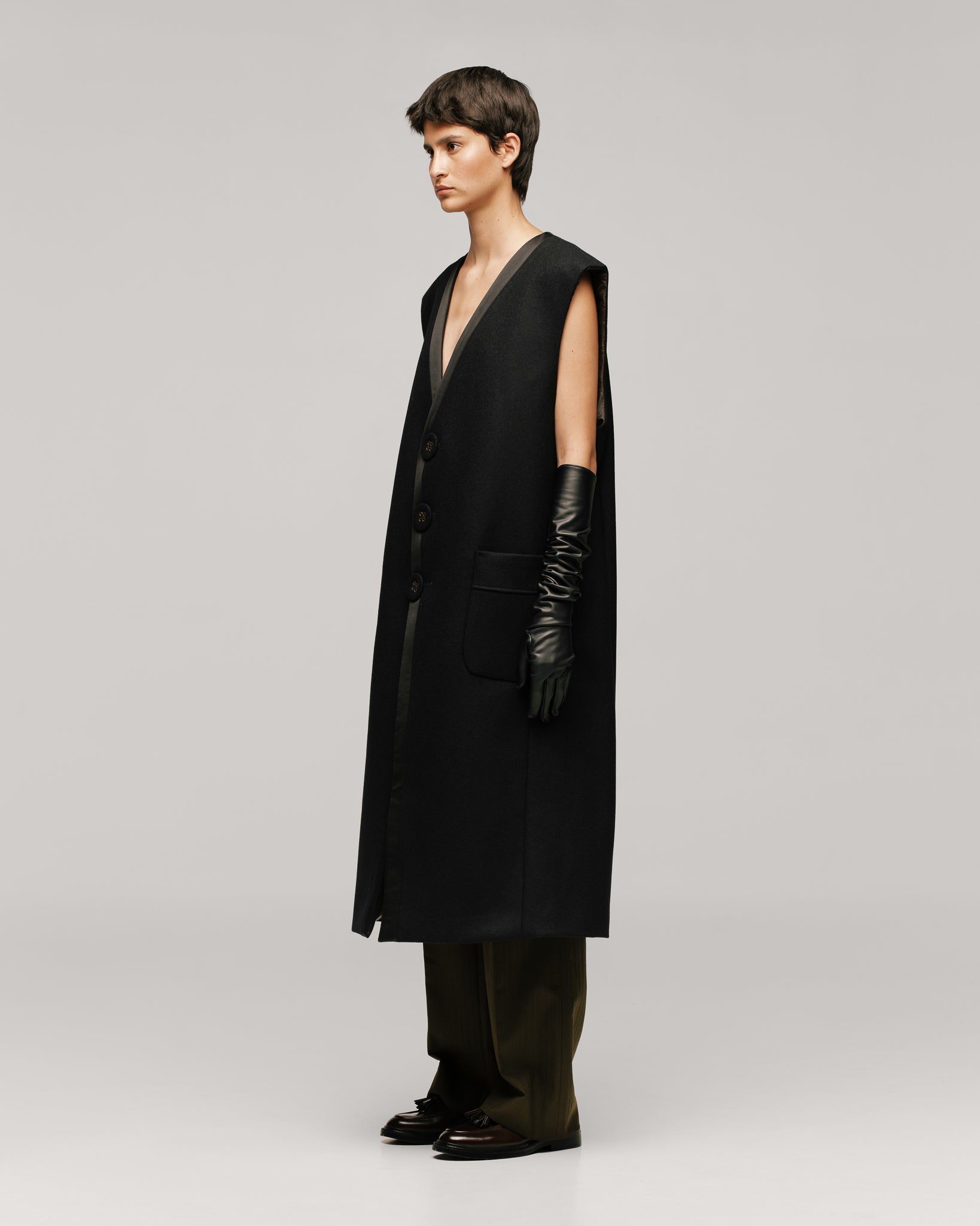 Chaleco largo estructurado en paño negro, con escote profundo en “V” y silueta recta y amplia. Detalles en seda en la botonadura y solapas simuladas, bolsillos frontales de parche. Interior forrado en viscosa. Bufanda complementaria en paño, bordes en seda.