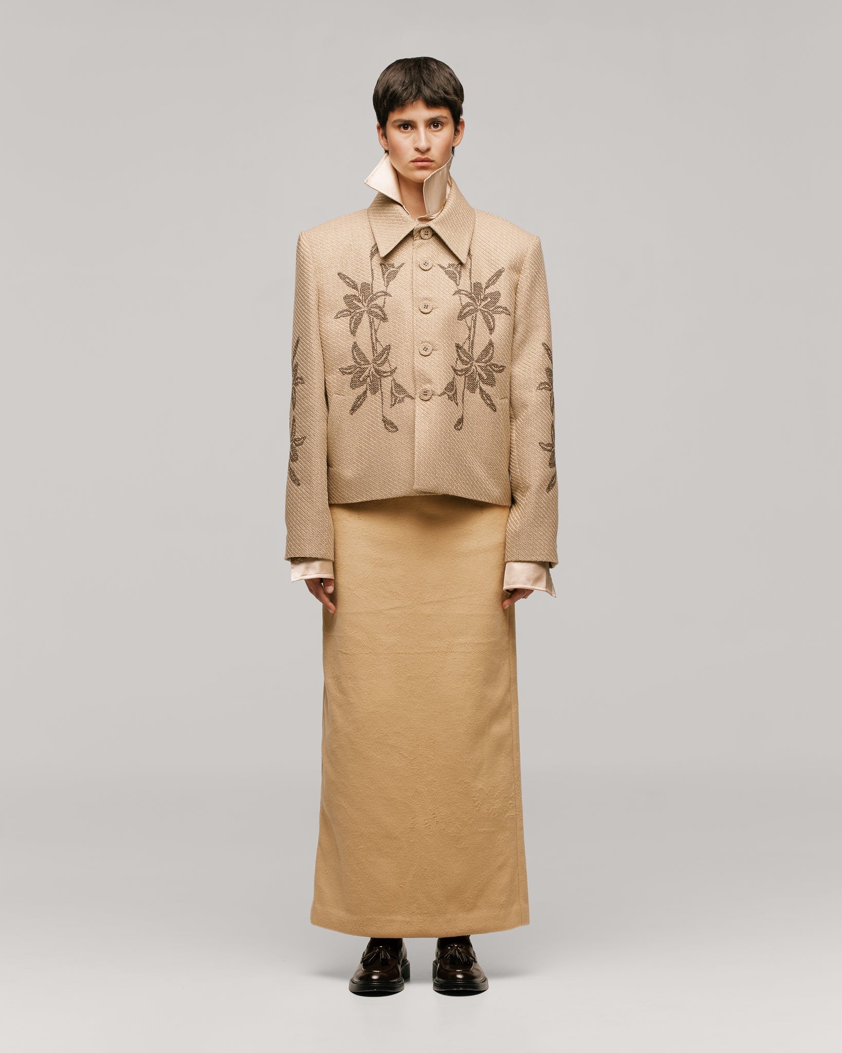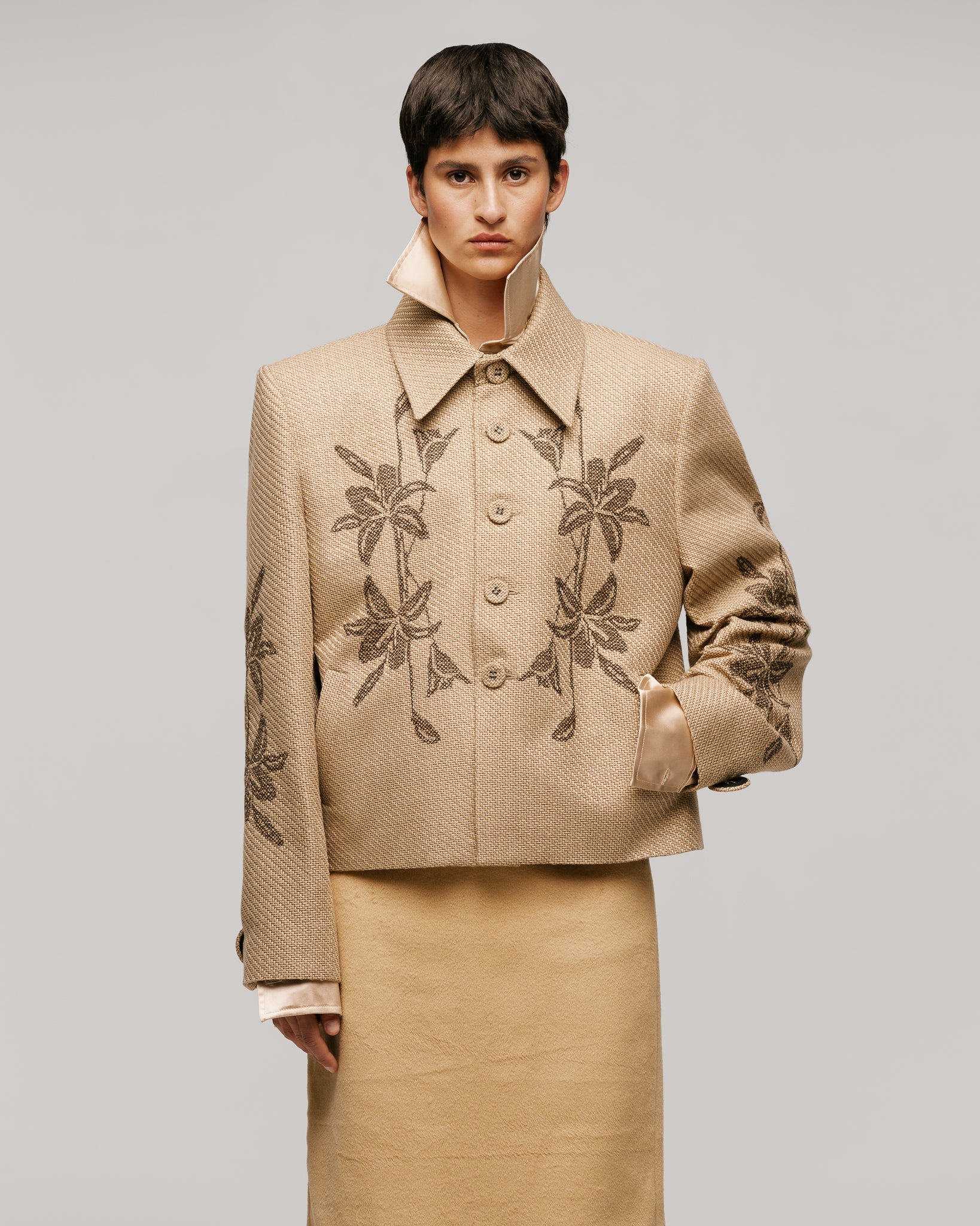 Chaqueta corta en tela de yute y poliéster. Botonadura frontal con botones forrados en tela. Cuello sport. Bolsillos de ribete en diagonal. Bolsillo de pañuelo en el pecho. Silueta recta. Motivo de flores bordado en técnica punto de cruz localizado en mangas y delanteros. Interior forrado en viscosa.