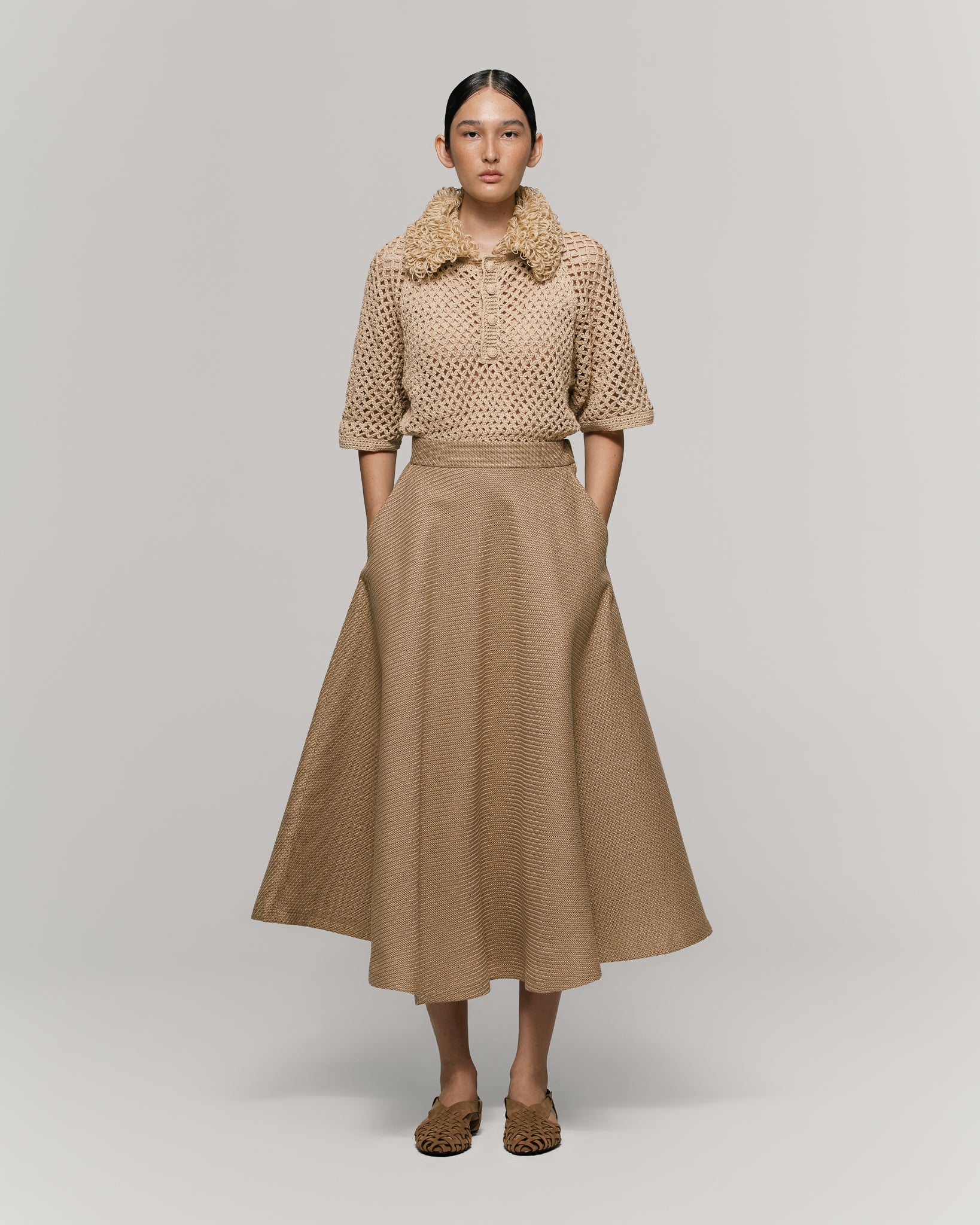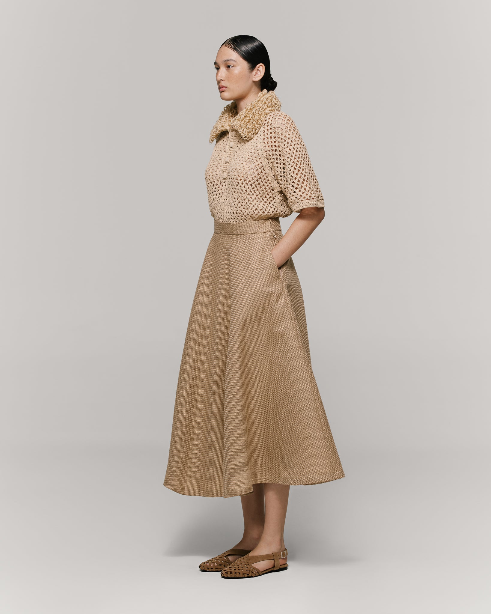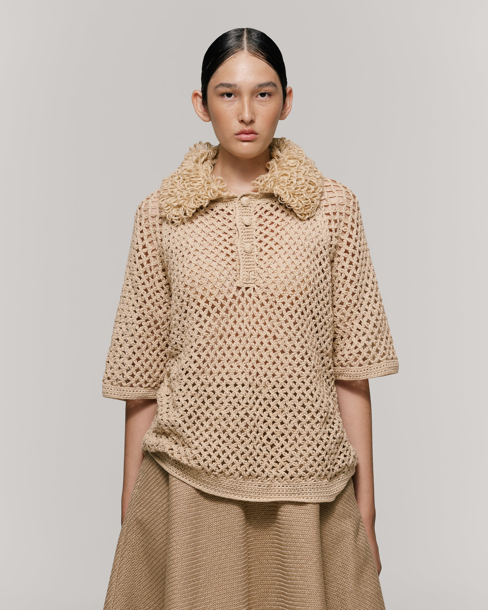 Shirt in sand yarn, crafted in 100% handmade crochet technique. Straight silhouette, with elbow-length sleeves and a wide collar in fringed texture. Front placket with buttons covered in the same fabric. Unique artisanal piece.