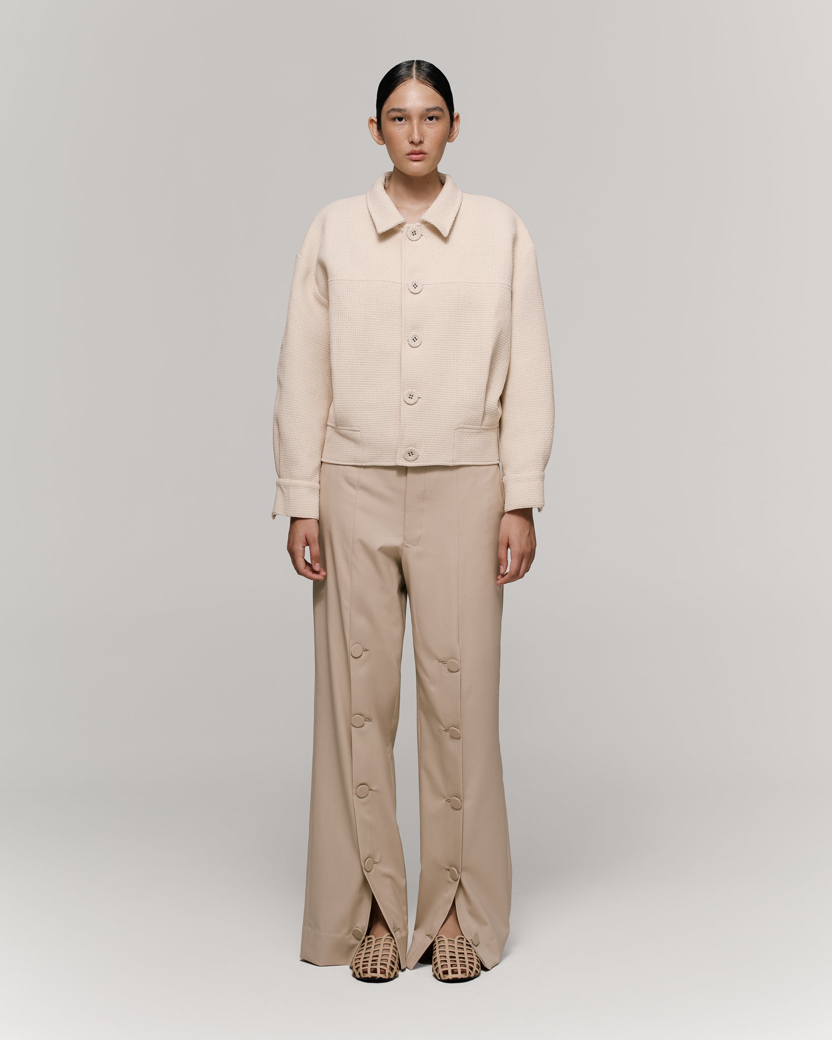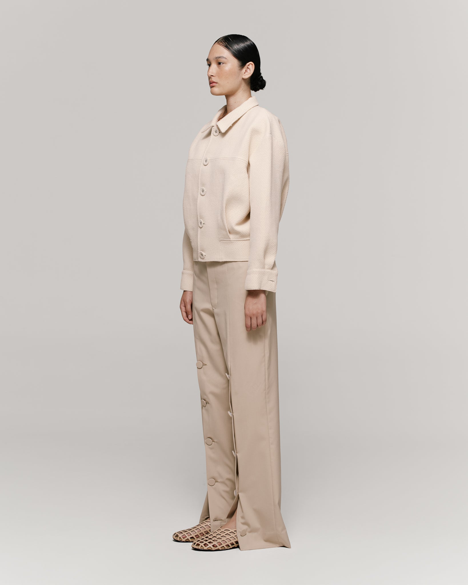 Short jacket in ivory fabric, with sport collar and five-button closure. The silhouette has subtle volume thanks to pleats at the hem, creating a slightly ballooned effect. Features dropped
