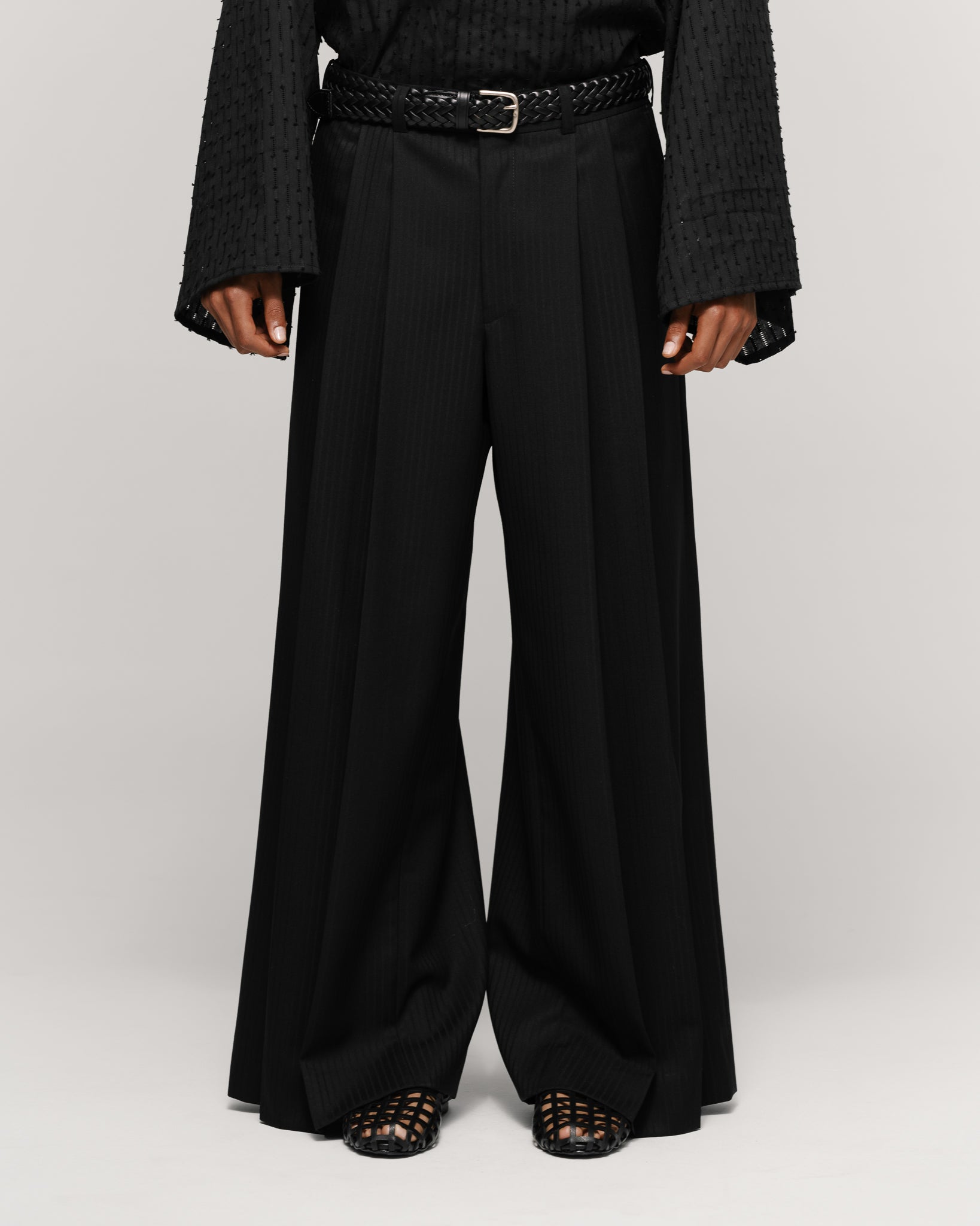 Wide-leg trousers in black fabric with fine tonal lines, featuring two deep front pleats. Detailed with a concealed waistband with belt loops.