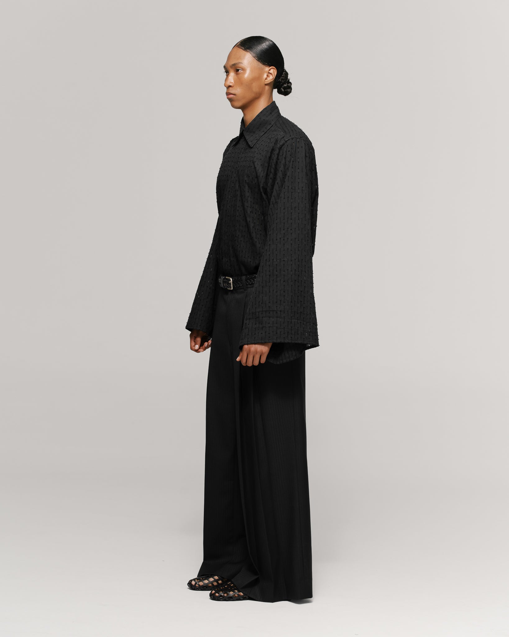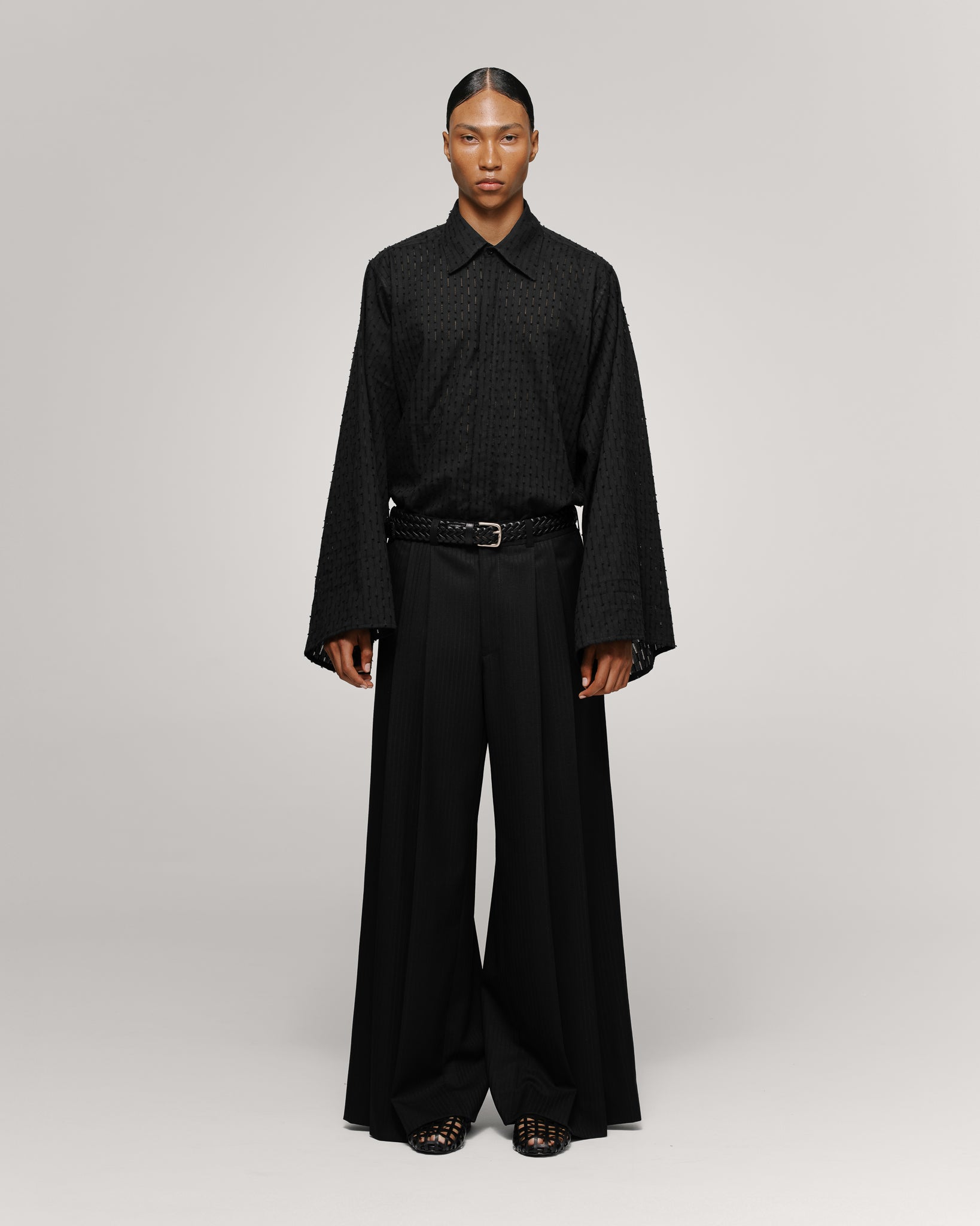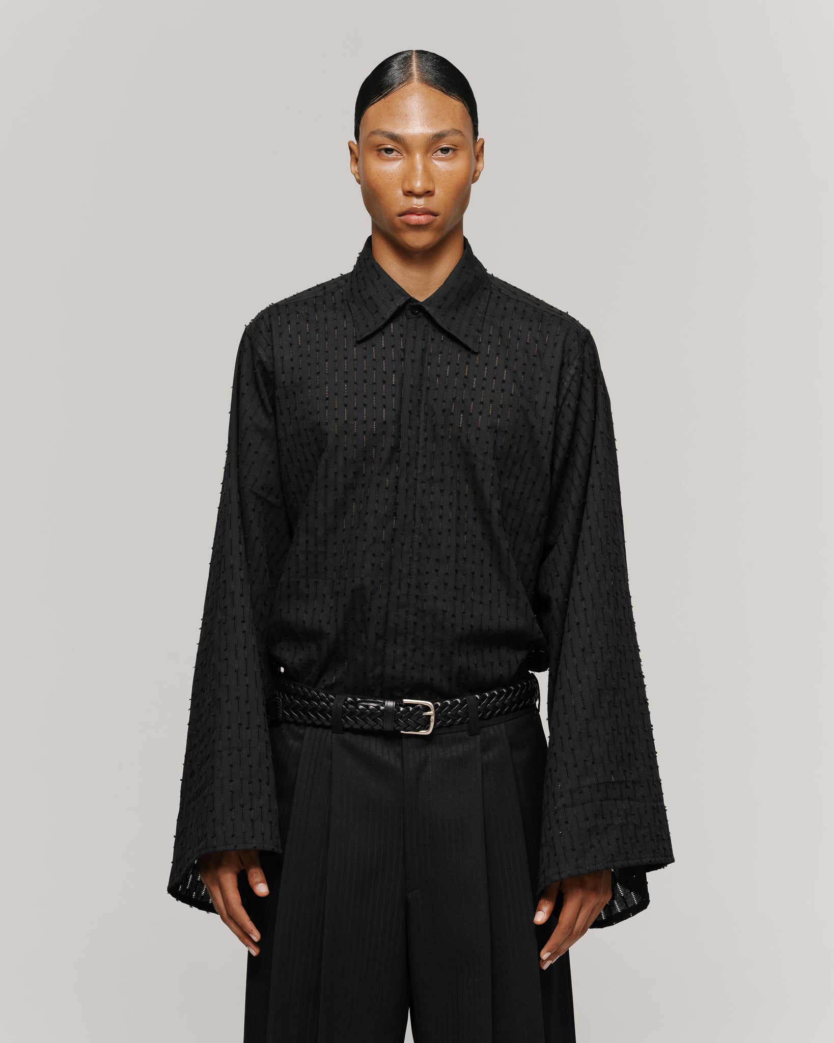 Shirt in black openwork linear fabric, with French collar, hidden placket, and straight shoulders. Wide silhouette. Detailed with extended structured cuffs.