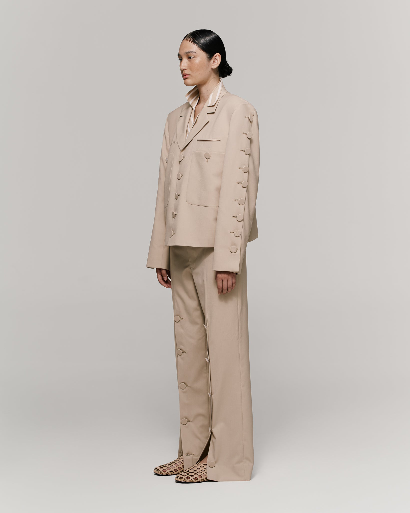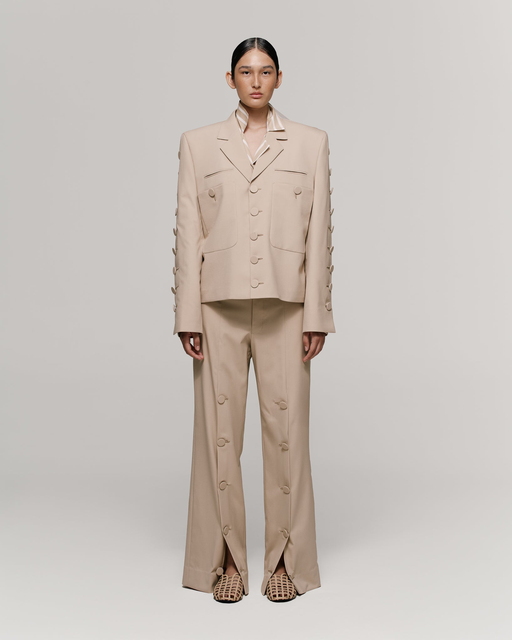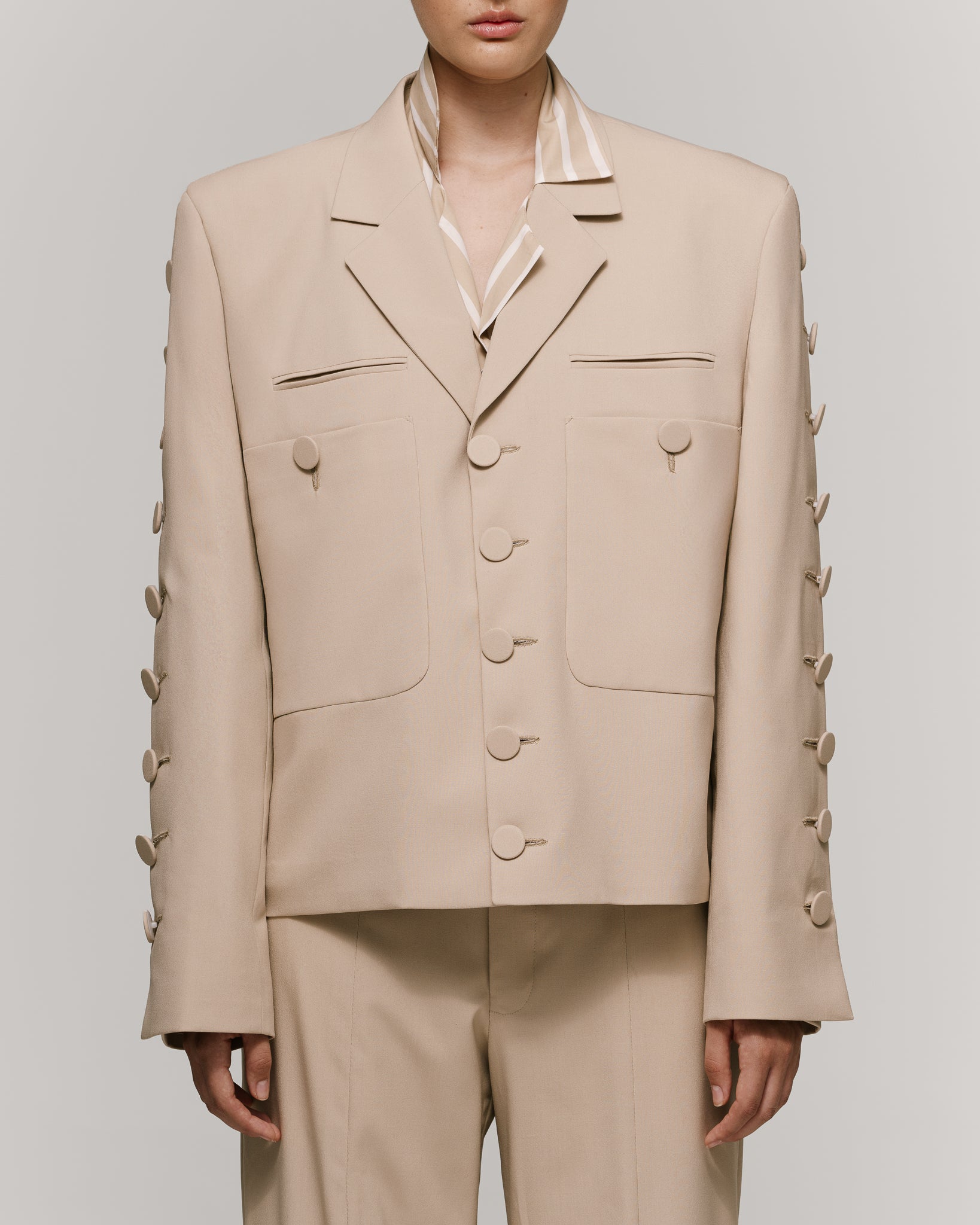 Two-piece suit in beige fabric, consisting of a short jacket with straight silhouette, traditional lapel, and five-button closure, featuring patch pockets that close with a button and welt pockets at chest level. Detailed with functional nine-button fastening on the sleeves. Lined interior. Paired with wide trousers with front openings that close with buttons. Buttons covered in the same fabric.