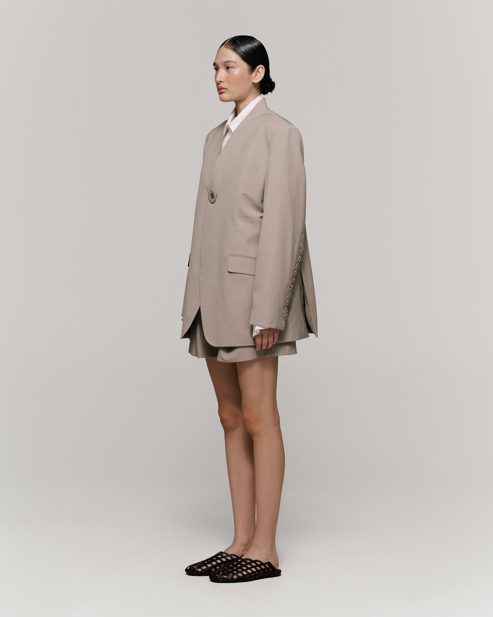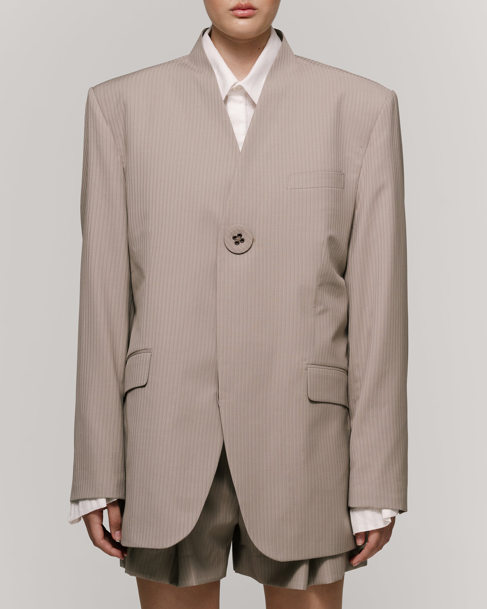 Two-piece suit in gray fabric with fine tonal stripes, consisting of a straight silhouette jacket without lapel, with an exposed front button and three hidden buttons inside, featuring flap pockets. Detailed with functional ten-button fastening on the sleeves. Lined interior. Buttons covered in the same fabric. Paired with wide shorts with a deep pleat.