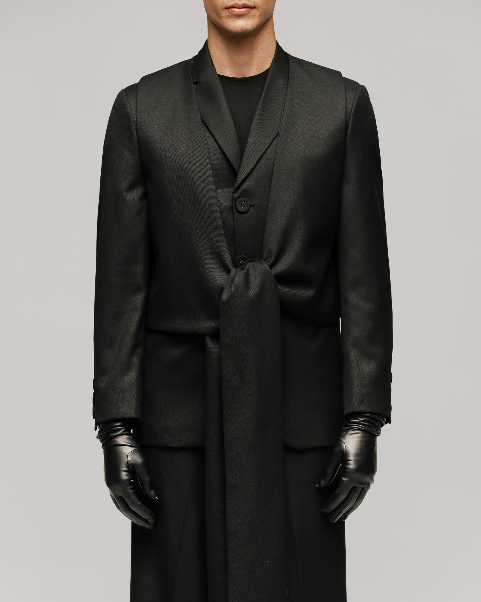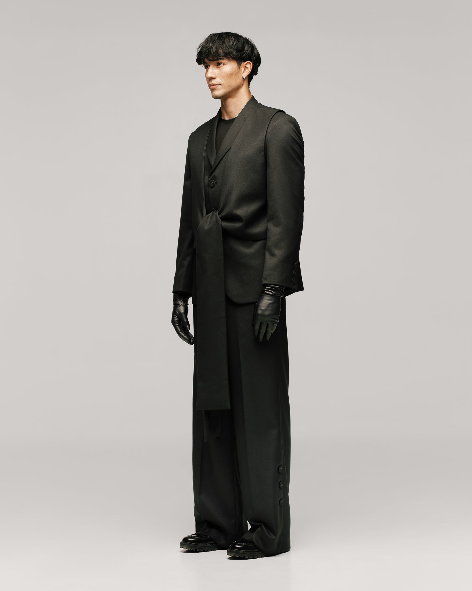 Traje de dos piezas en paño color negro. Se compone de: Chaqueta de silueta amplia, Solapa tradicional. Botonadura frontal con 2 botones forrados. Bolsillos de ribete. Se complementa con un chaleco removible, que se anuda en la parte delantera. Interior forrado en viscosa. Pantalón de tiro medio, bota recta.