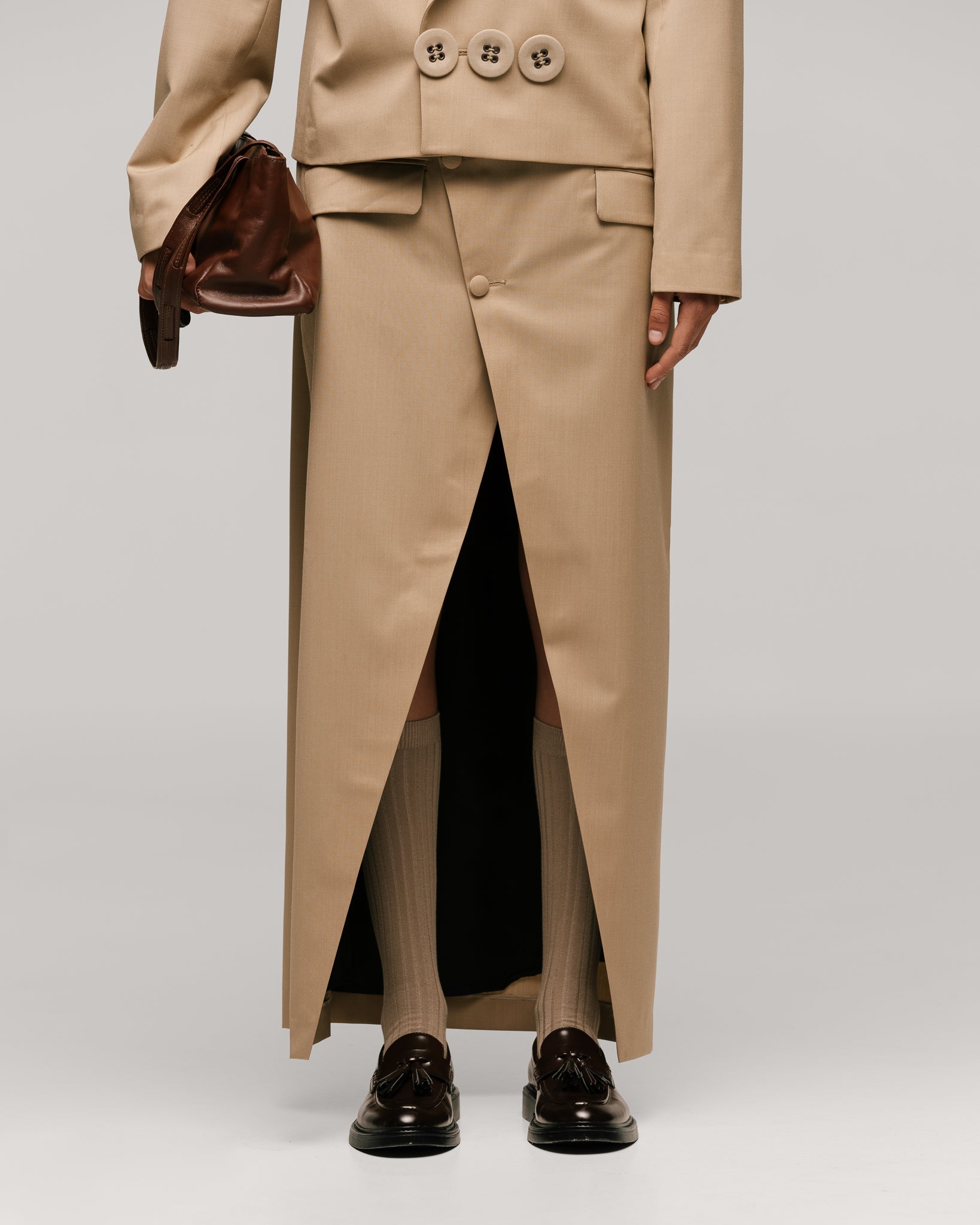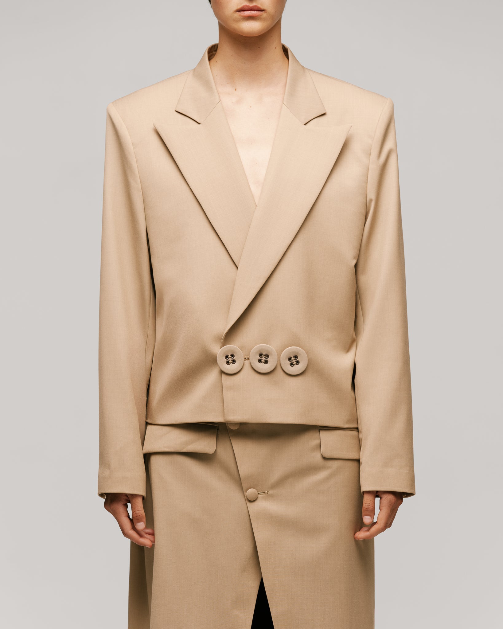 Conjunto de sastrería contemporánea de 2 piezas en tono beige compuesto por: Chaqueta de corte cuadrado y estructura amplia, con solapa en punta y cierre cruzado de tres botones. Interior forrado en viscosa. Falda recta de largo midi con abertura frontal profunda, cerrada con un solo botón forrado al centro.