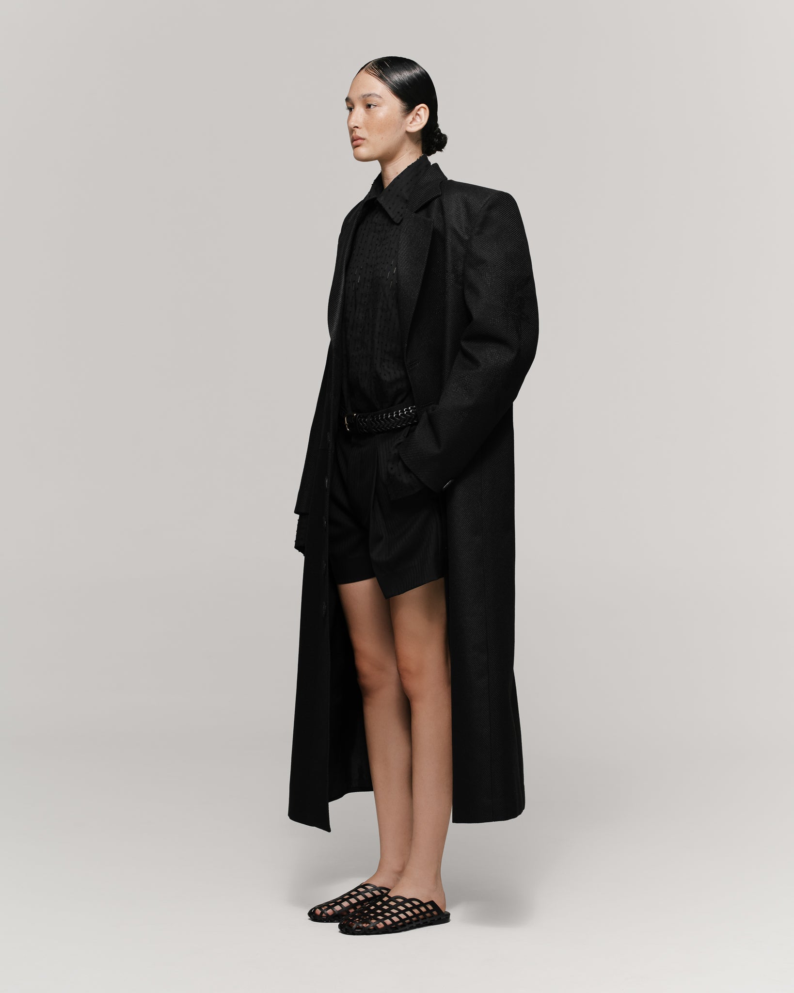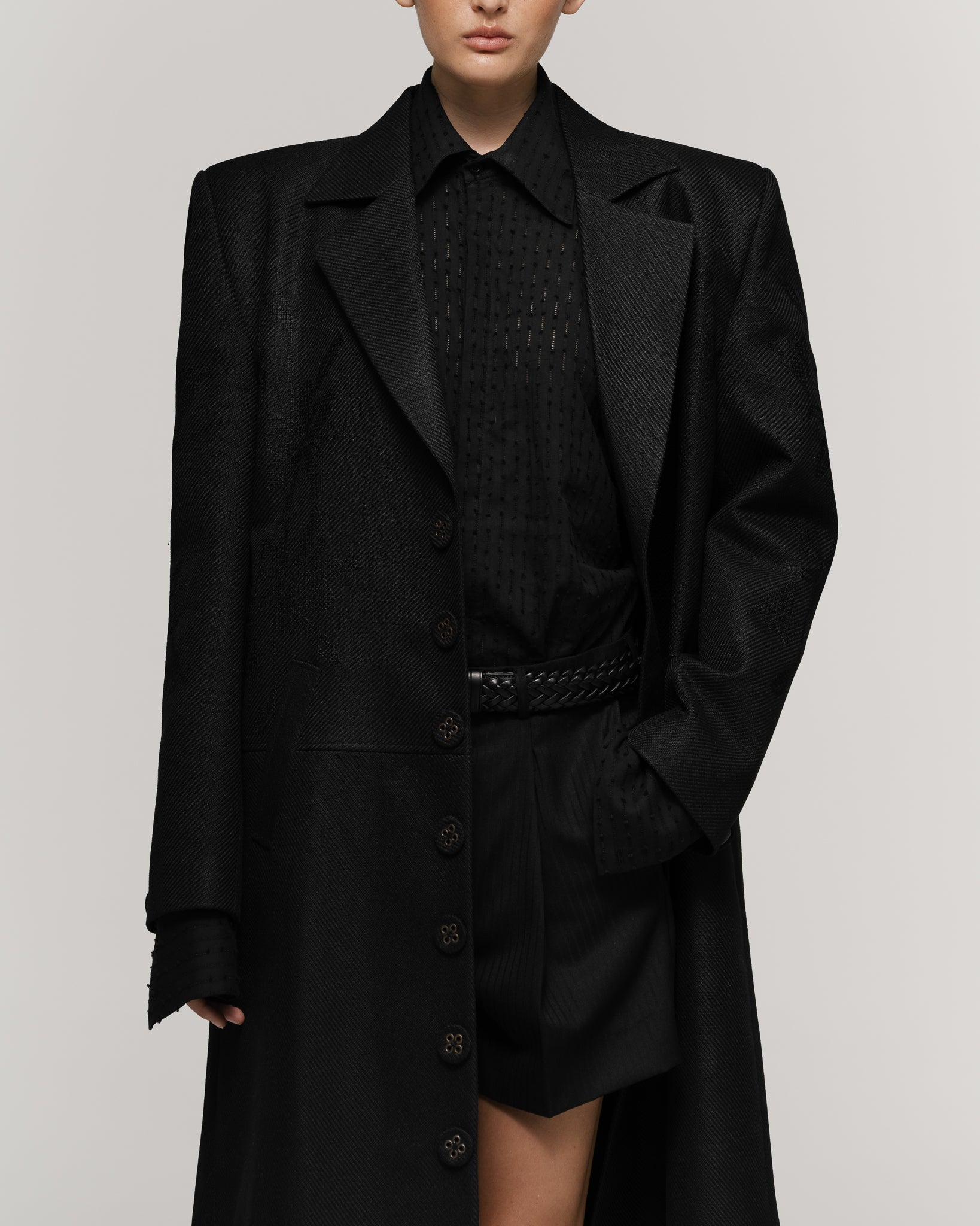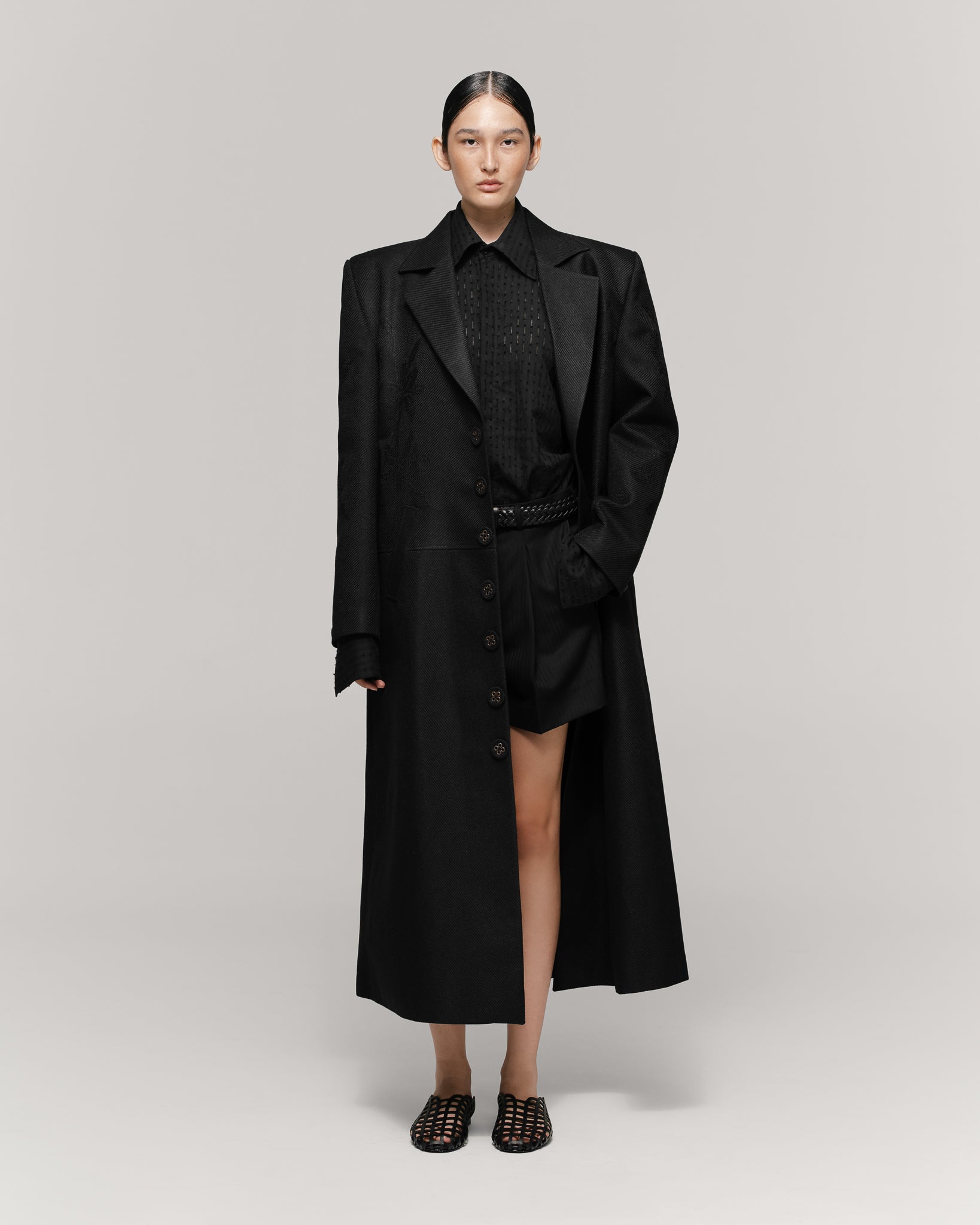 Long black jute coat with a flared silhouette created by volume at the back. Traditional lapel and diagonal pockets. Detailed with tonal machine cross-stitch embroidery of lilies on the